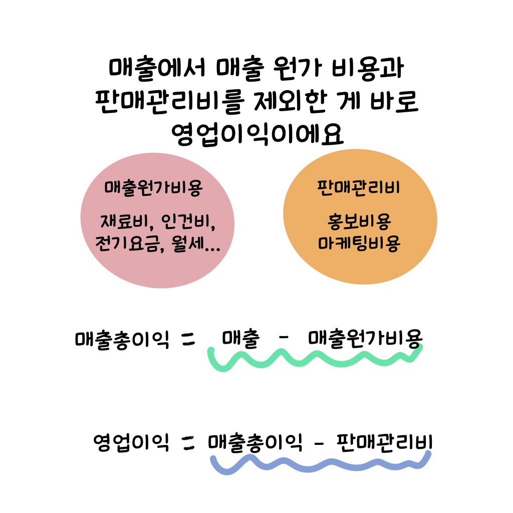 전체 매출에서 매출원가비용을 제외하면 매출총이익이라고 합니다. 여기서 판매관리비를 제외하면 영업이익이 나와요!