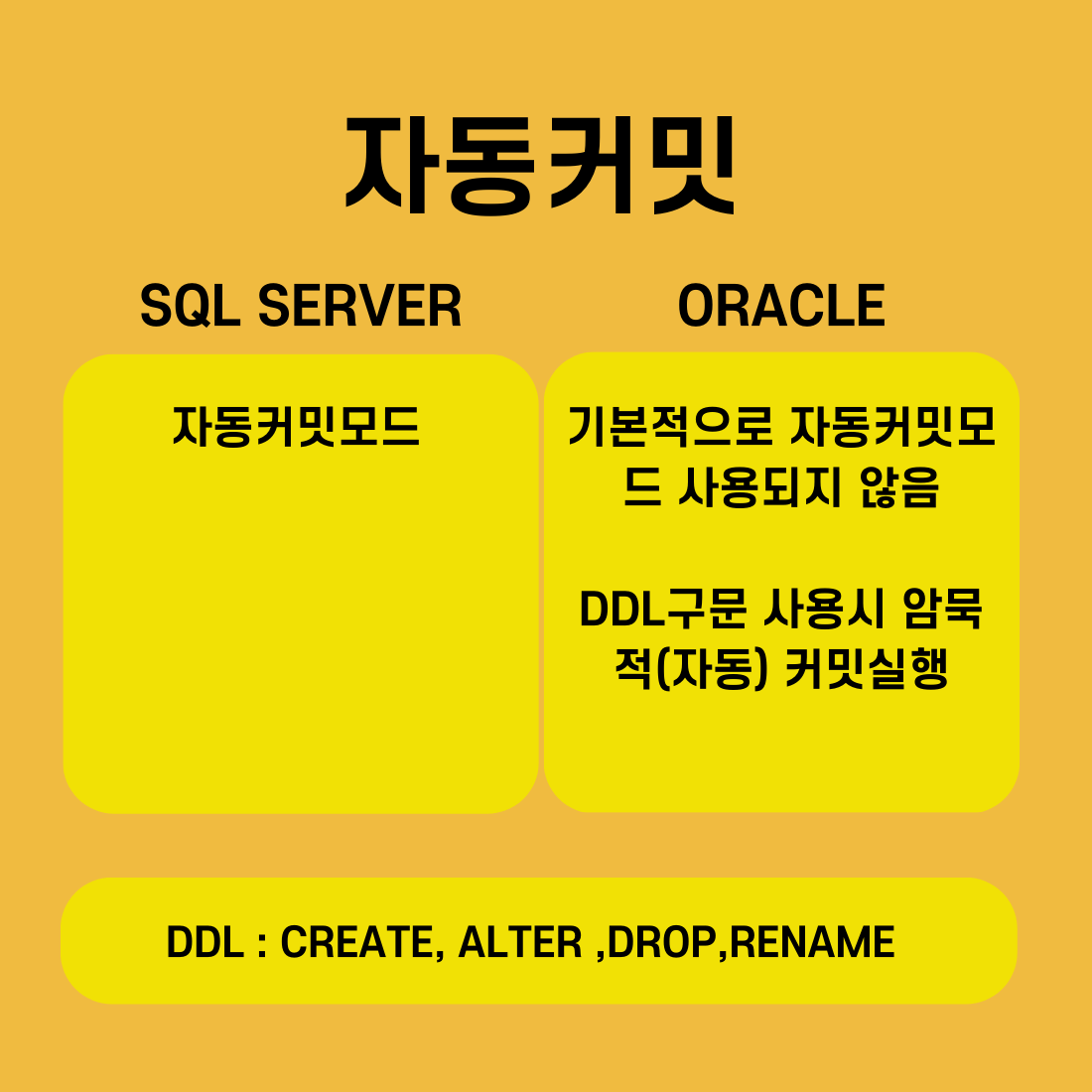 자동커밋 또는 암묵적 커밋이라고도 하는데요. 말 그대로 commit을 작성하지 않아도 알아서 자동으로 commit이 되는 경우가 있습니다. 이와 관련해 SQL Server와 ORACLE 각각 다른 특징을 보이는데요.